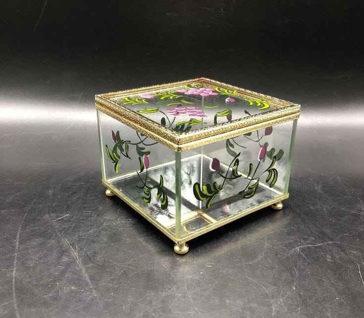 Luxury Hand-Painted Glass Jewelry Box with Floral Design Clear Glass Trinket Storage Box Gold Metal Frame Customizable Gift Box