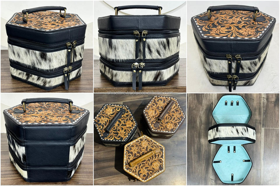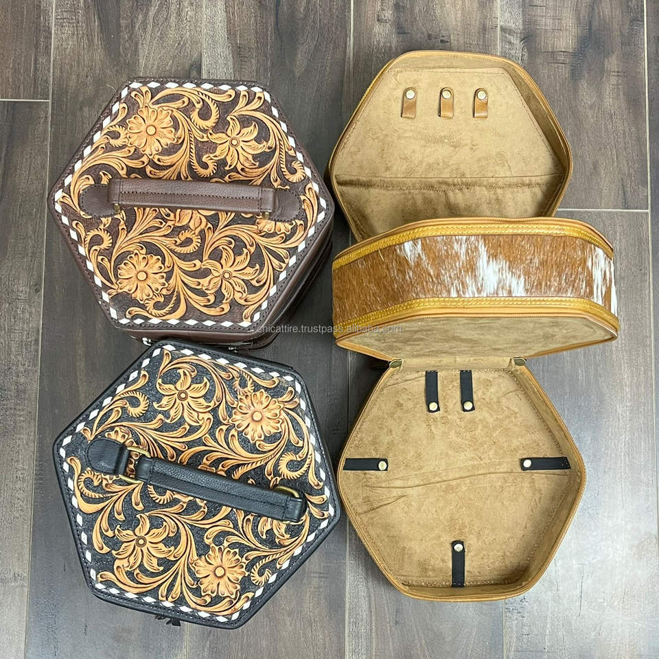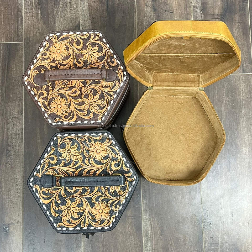 Luxury Hand Tooled Cowhide Leather Zipper Jewelry Storage Organizer Case Bracelet Watch Necklaces Hexagonal Jewelry Travel Box