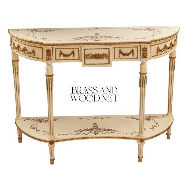 Luxury Handcrafted Ivory & Gold Console Table with Brass Ornaments and Painted Floral Details in Classic European Style