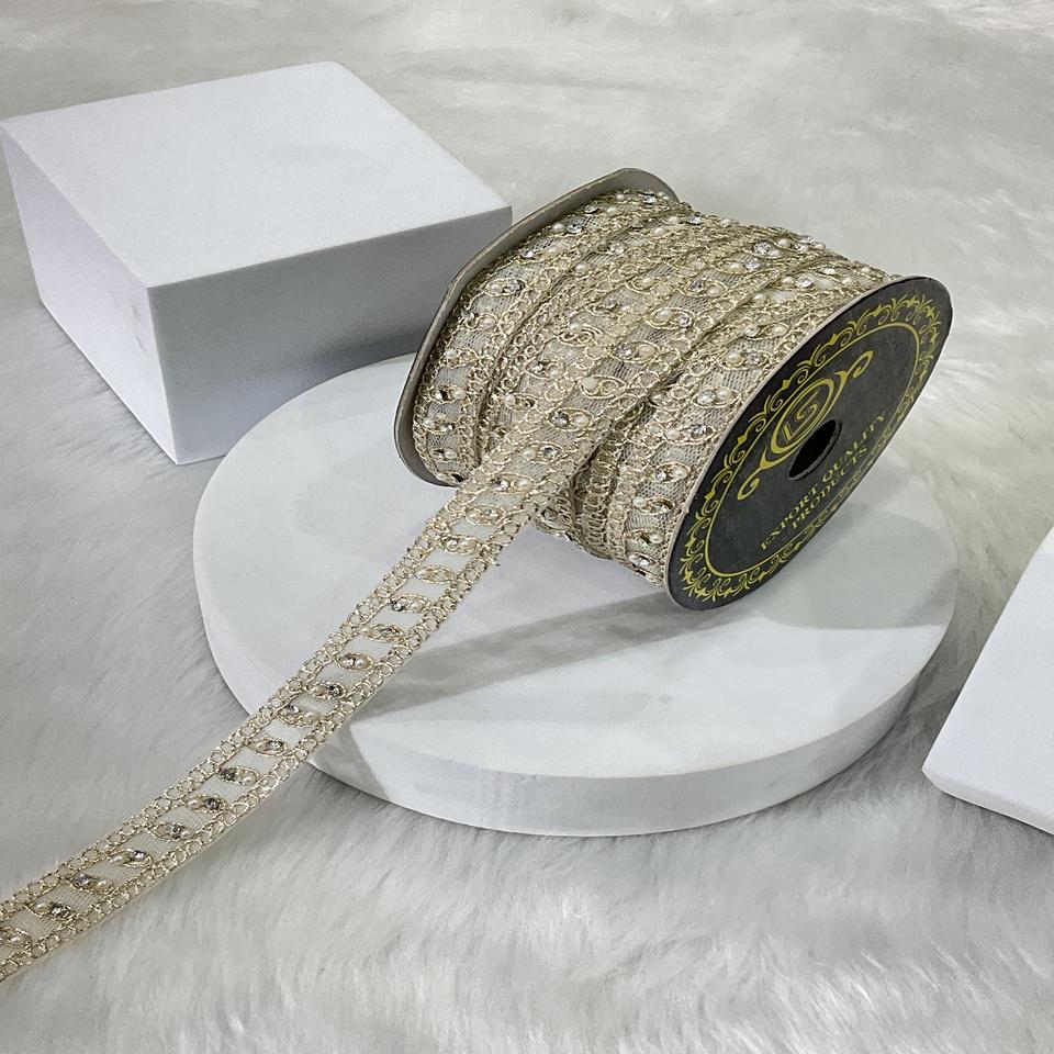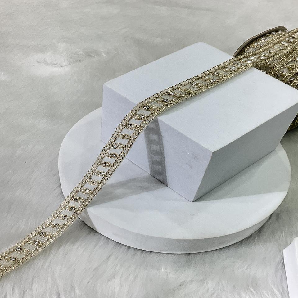 Luxury Handcrafted Mini Diamond Moti Embellished Sarees Gowns Bridal Wear in Pearl Border Trim Pani Lace Fabric