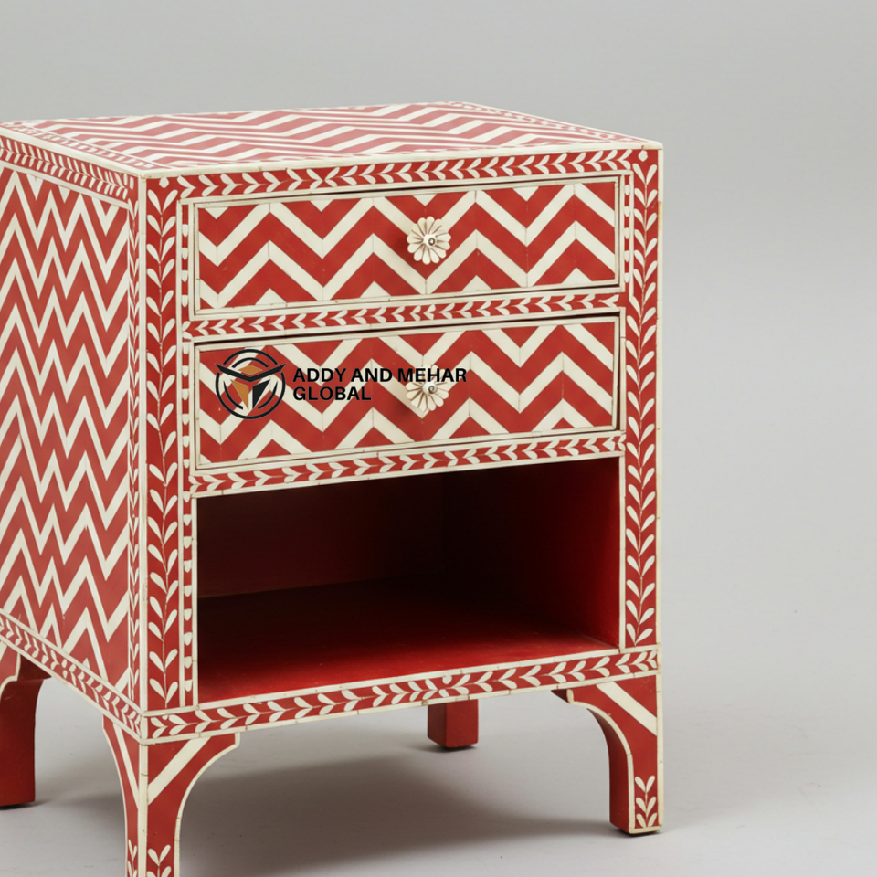 Luxury Handcrafted Red Bone Inlay Chest Floral Motif Nightstand with 3 Drawers