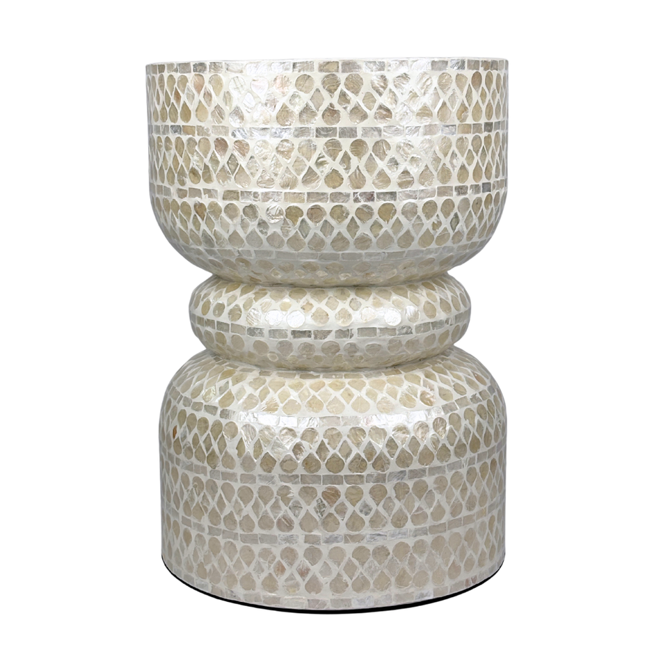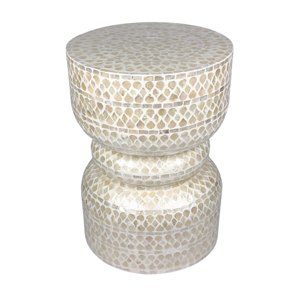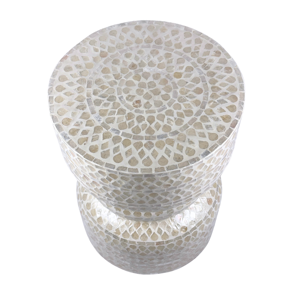 Luxury Handcrafted Round Drum Stool with Capiz Shell Inlay, Geometric Pattern Accent Table for Home Decor and Living Room