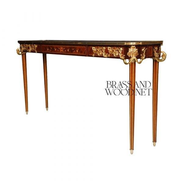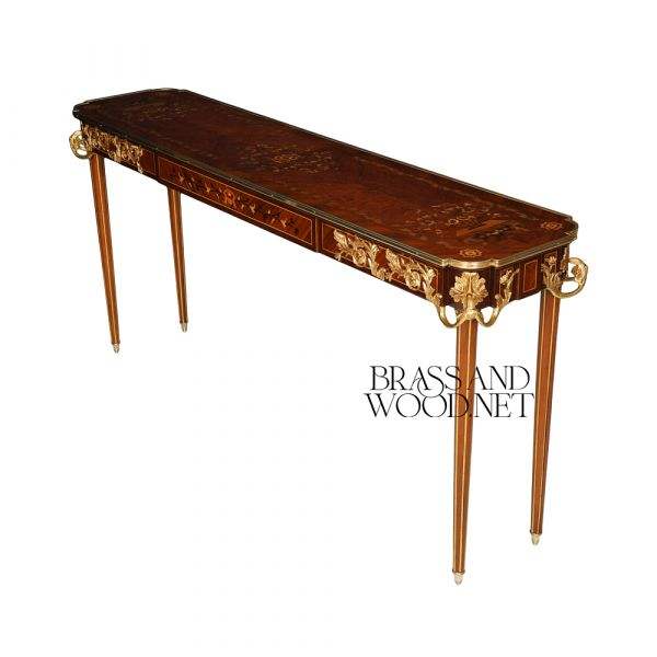 Luxury Handcrafted Wooden Console Table with Fine Marquetry Inlay, Slim Tapered Legs and Elegant Brass Ornaments
