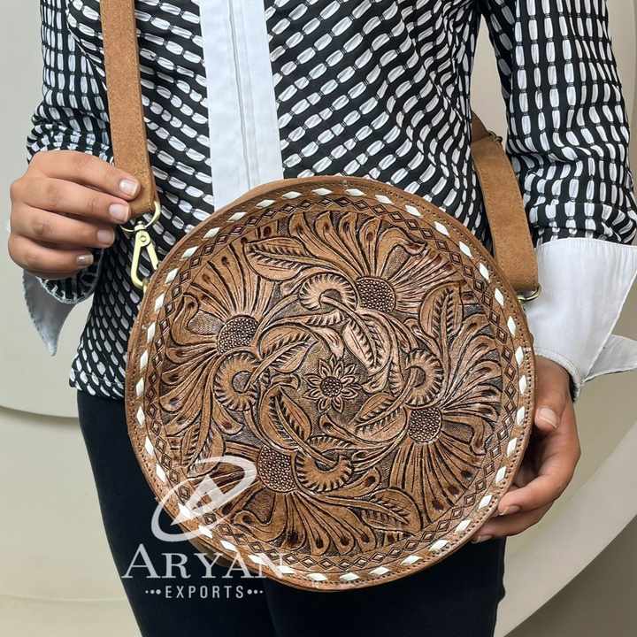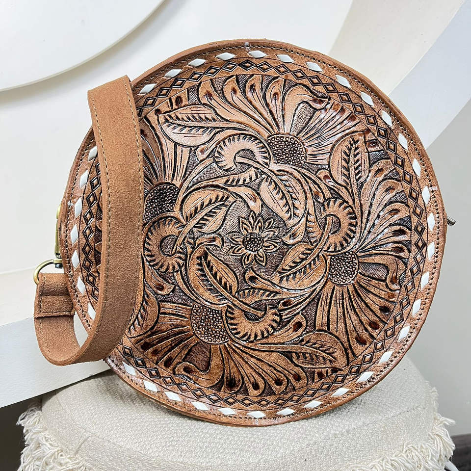 Product name:Floral Design Hand Tooled Leather Round Bag