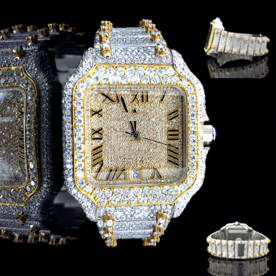 Luxury Handmade Moissanite Diamond Watch Fully Iced Stainless Steel Square Glass 10 Bar Water Resistant Bracelet Clasp Burst