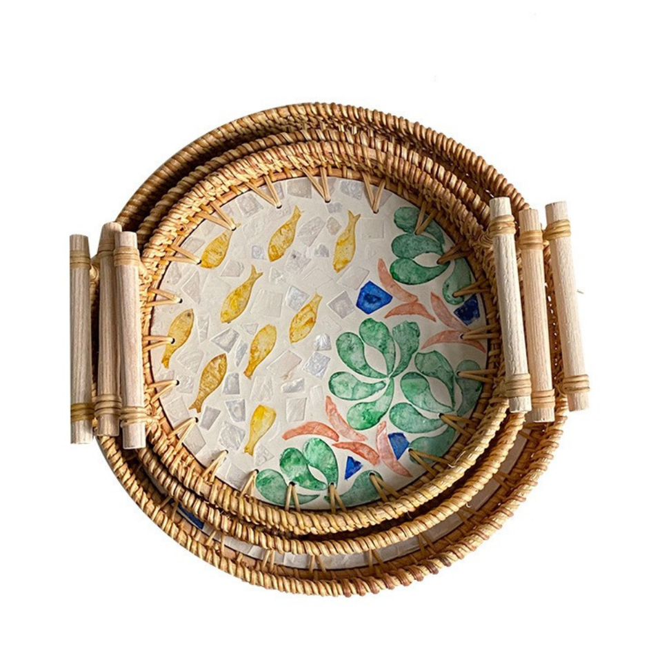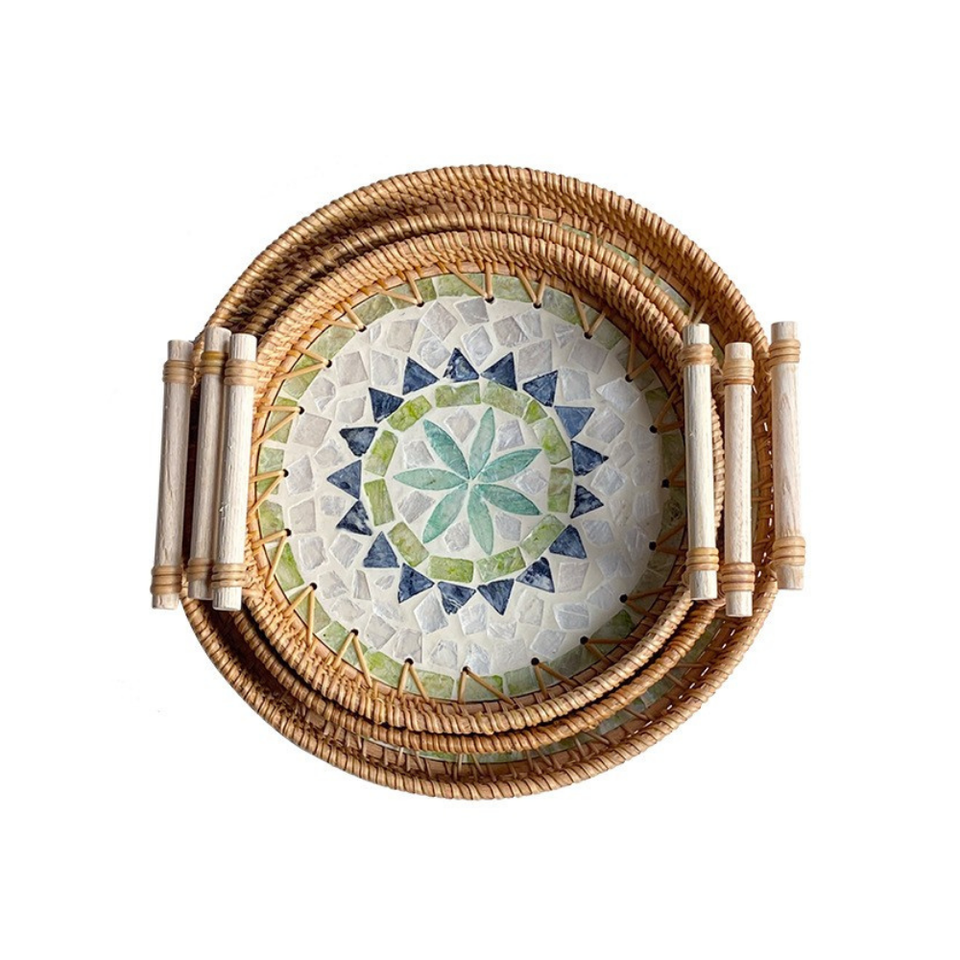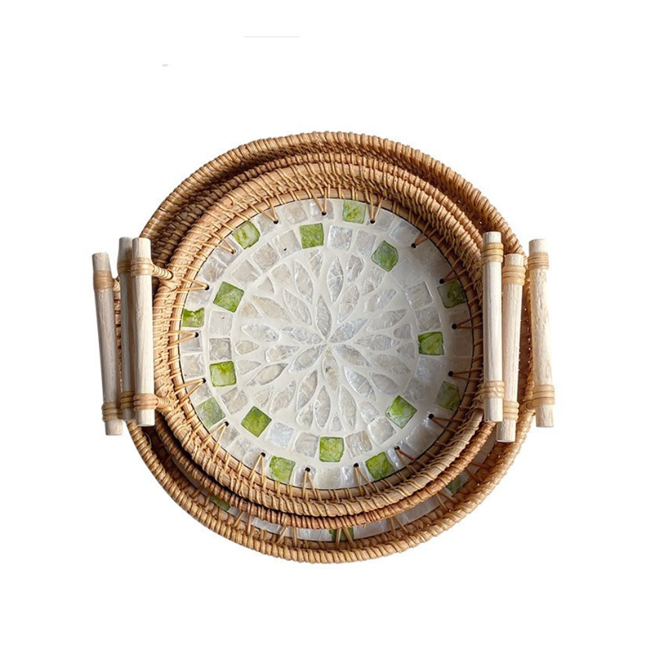 Luxury Handmade Rattan & Nacre Serving Tray with Rustic Mother Pearl Design Breakfast in Bed Tray Handle