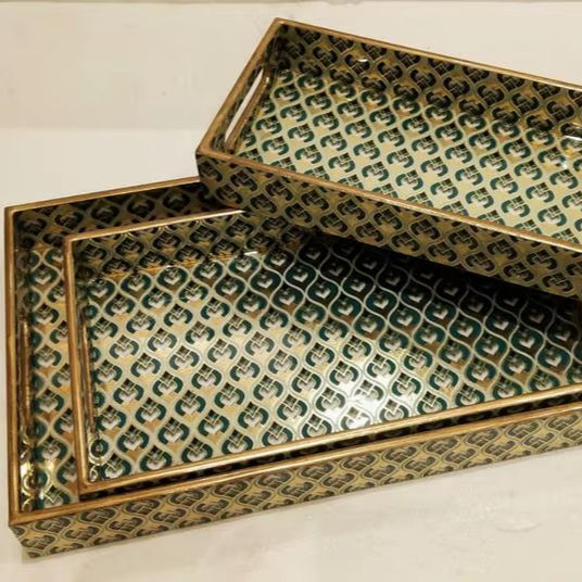 Luxury Handmade Wooden Serving Tray Set Green Gold Pattern Rectangular Lacquer Tray For Coffee Table Home Decor Ottoman Gift