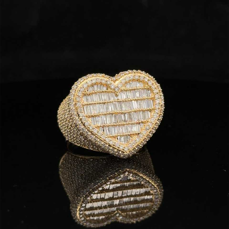Luxury Heart Shapes Full Iced Diamond Proposal Ring Baguette and Round Cut Lab Grown 14K Yellow Gold Fine Engagement Party Ring