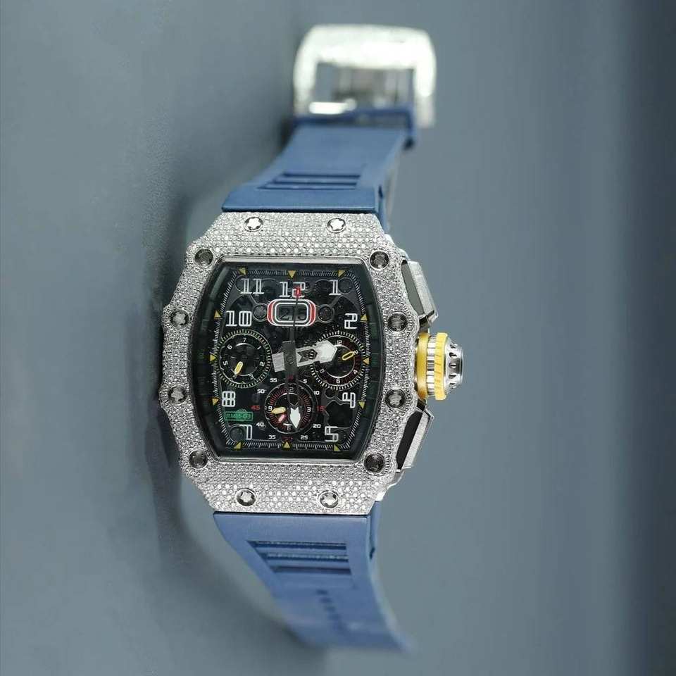 Luxury High Quality Diamond Paved Skeleton Flyback Chronograph Watch Sapphire Crystal Analog Large Date Blue Rubber Hip Hop