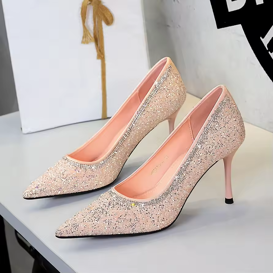 Luxury High Quality Fashion Women Wedding Dress Shoes Rhinestone Shiny Bridal Ladies Heeled Pointed tip Ladies Office Heel Shoes