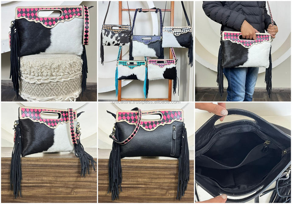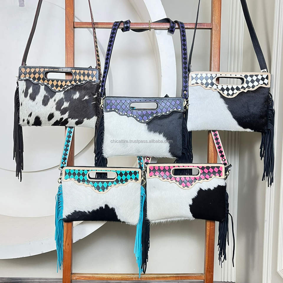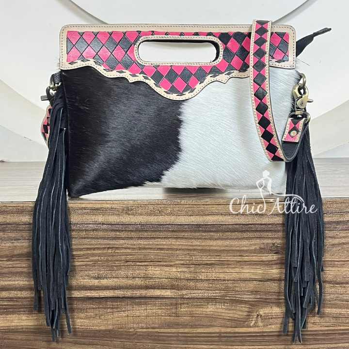 Product name:Tooled Cowhide Checkered Leather Fringe Handled Crossbody Bag