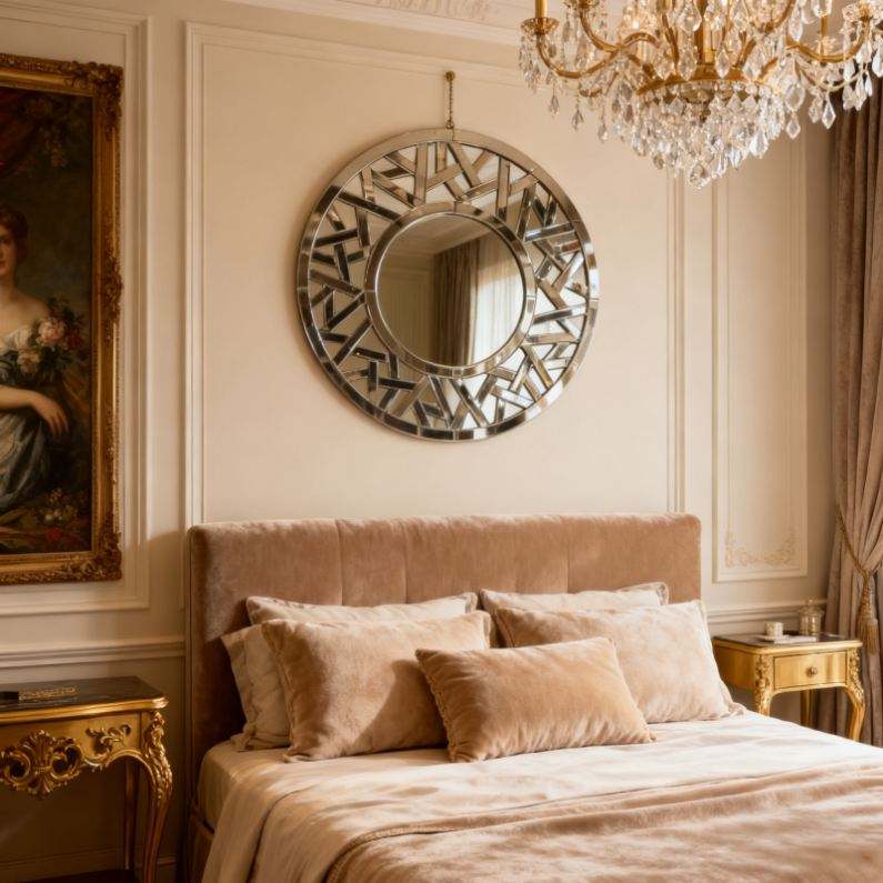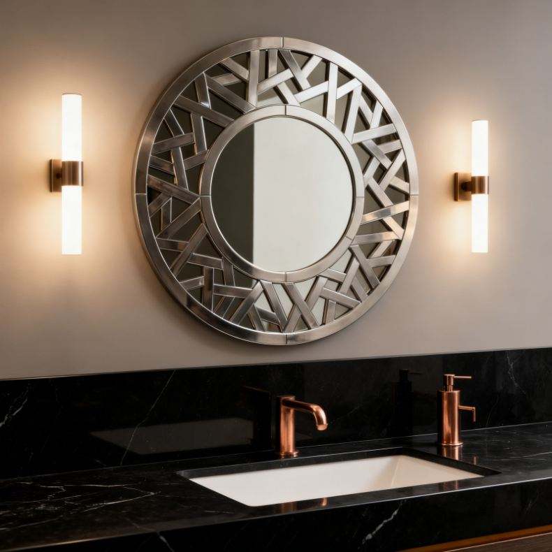 Luxury Art Deco Handmade Round Silver Diamonds Wall Mirror with Geometric-cut Hollow-out Design Home Decor