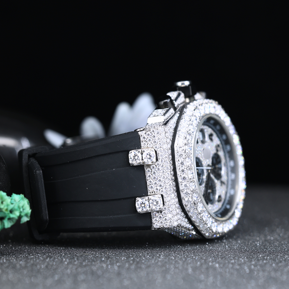 Luxury Iced Out Chronograph Watch – Full Moissanite Diamond CZ Bezel Men’s Quartz Watch with Black Rubber Strap