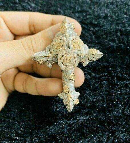 Luxury Iced Out Floral Cross Pendant VVS Moissanite Gold Finish Hip Hop Jewellery Diamond Look Faith Necklace