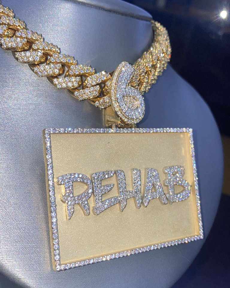 Luxury Iced Out Rehab Name Plate Pendant VVS Moissanite Gold Finish Cuban Chain Hip Hop Jewellery