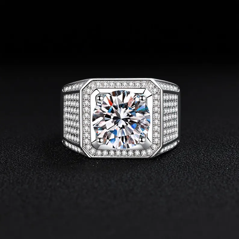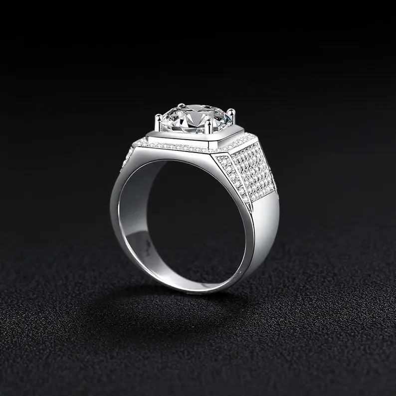 Luxury Iced Square Men's Hip Hop Ring Large Brilliant Moissanite Diamond Centerpiece Pave Setting Sterling Silver Rhodium Plated
