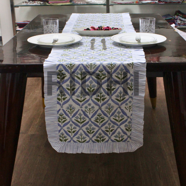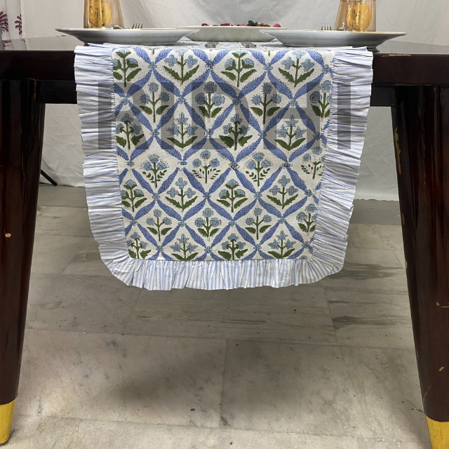 Luxury Indian Floral Coastal Blue 100% Cotton Customizable Ridhi Table Runner Ruffle Hand Block Printed Dining Hotel Wedding Use