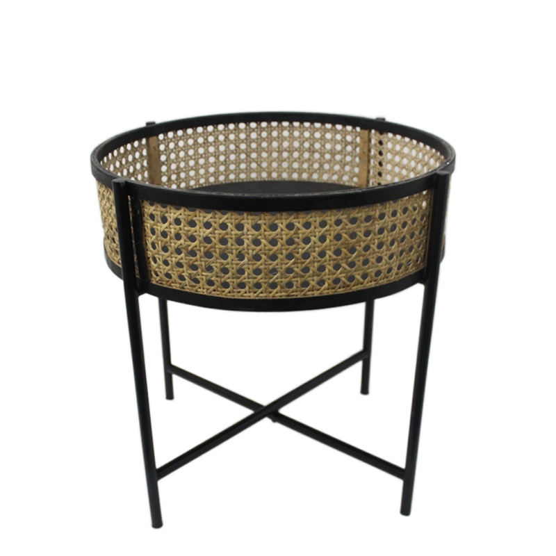 Luxury Iron & Cane Round Table Folding Legs Matt Black Natural Color Coffee Tables for Outdoor Living Room Furniture