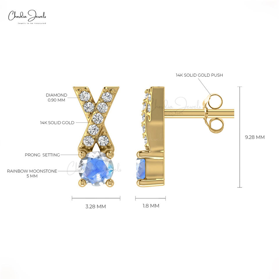 Luxury Items Real Rainbow Moonstone Studs 14k Solid Gold Round 0.9 CT Gemstone & Small Diamond X Shape Earrings at Factory Price
