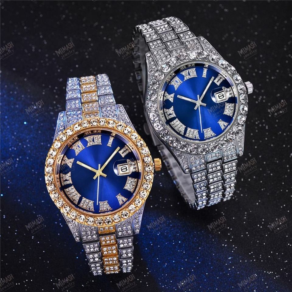 Luxury Lab Grown Diamond Iced Out Men Watch with Blue Dial, Roman Numeral Markers & Fully Bust Down Bracelet Hip Hop Style