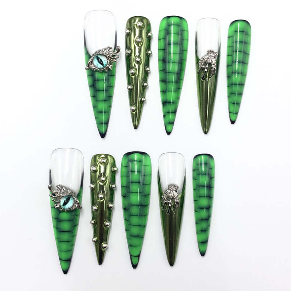 Luxury Long Coffin Nails Green Pattern Diamond Chic Aura Press-On Set