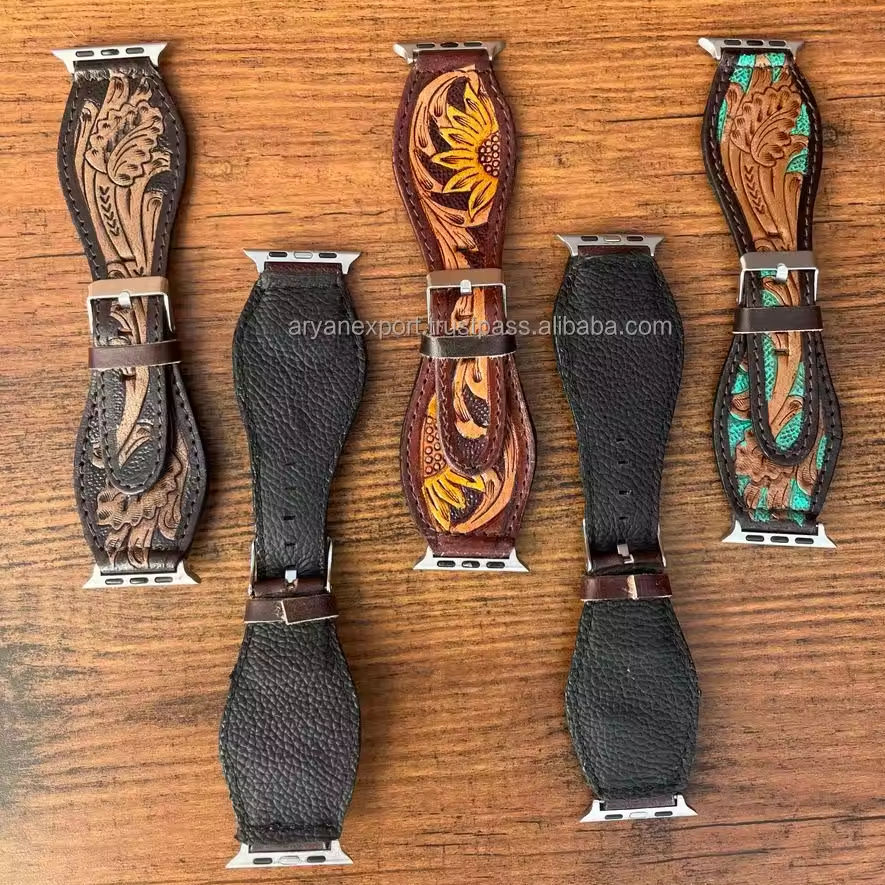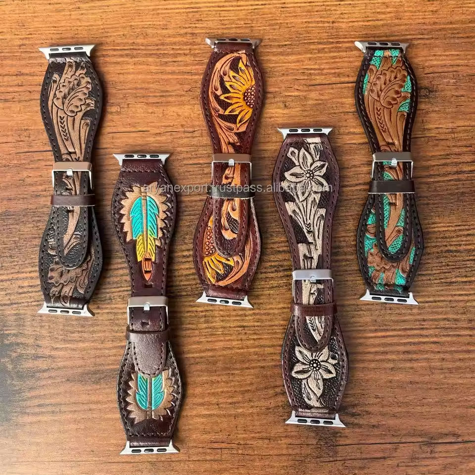 Luxury Man and Women Style Floral Hand Tooled Genuine Leather IPhone Watch Strap Beautiful Watch Hand Band Genuine Leather Strap