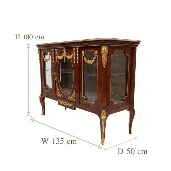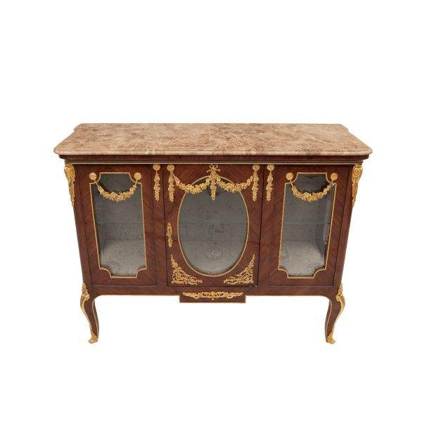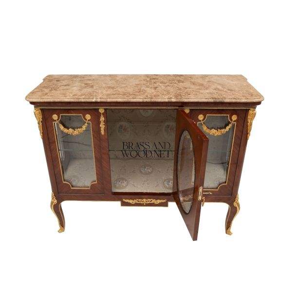 Luxury Marble-Top Wooden Vitrine Cabinet With Brass Ornaments