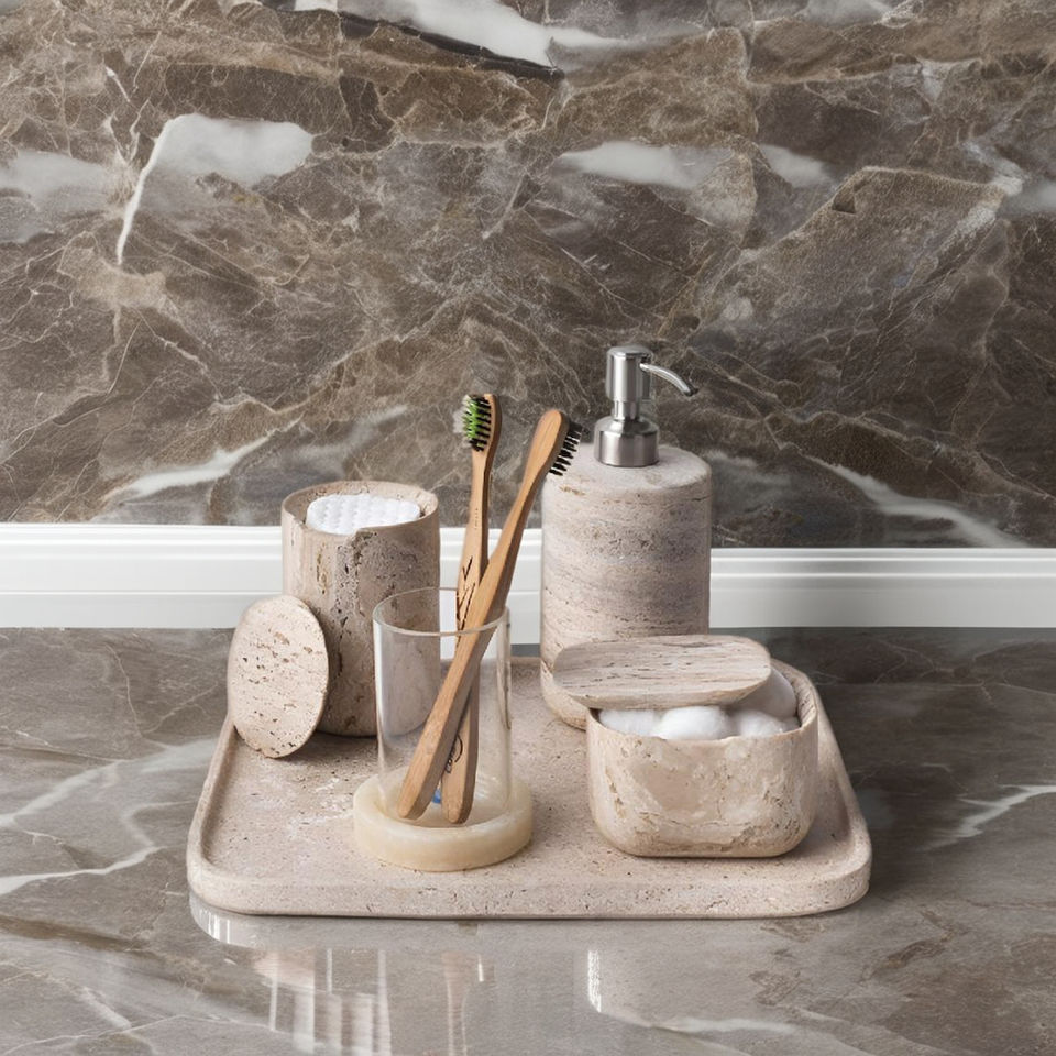 Luxury Marble & Travertine Bathroom Accessories Set 6-Piece Bathroom Decor Soap Dispenser Stone Bathroom Set