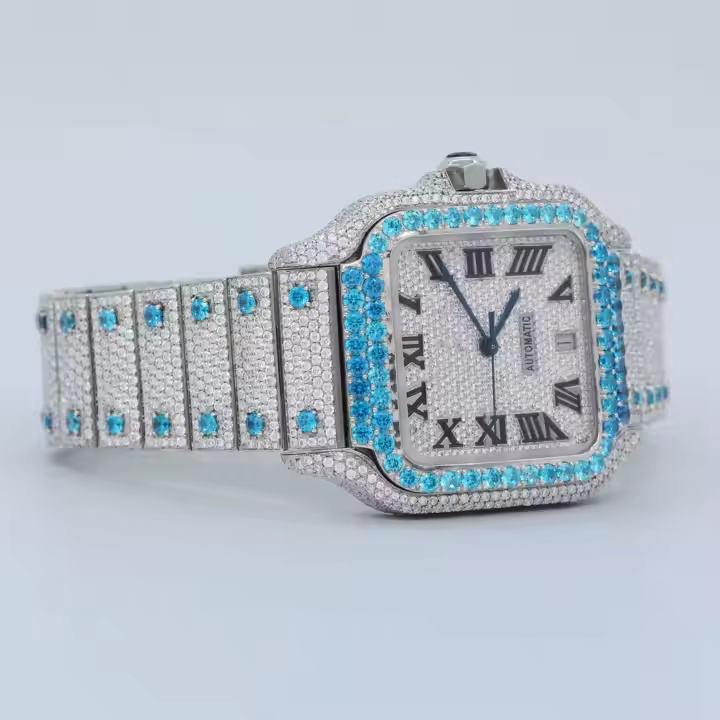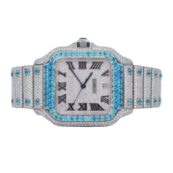 Luxury Quartz Blue Moissanite Watch Custom Blue Diamond Stainless Steel Leather Strap Men's ETA Movement Water Resistant