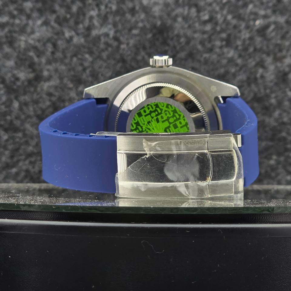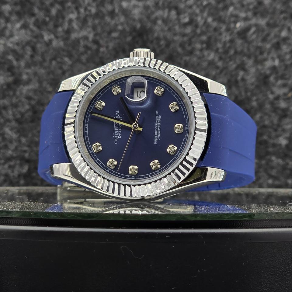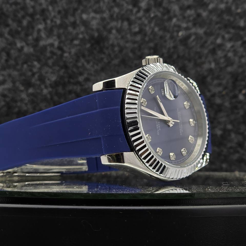 Luxury Men's Automatic Watch Stainless Steel Fluted BezelBlue DialDiamond Hour Rubber Strap Business Sport Mechanical Wristwatch