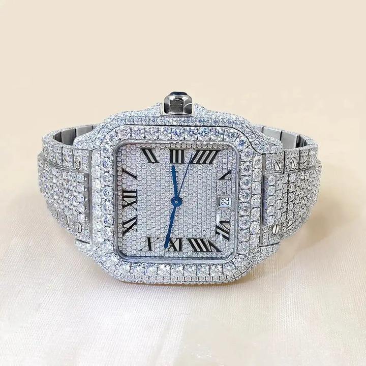 Luxury Men's Moissanite Diamond Watch Fully Iced Display D/VVS Studs Mechanical Square Stainless Steel Case Glass Quartz 27cm