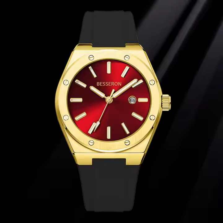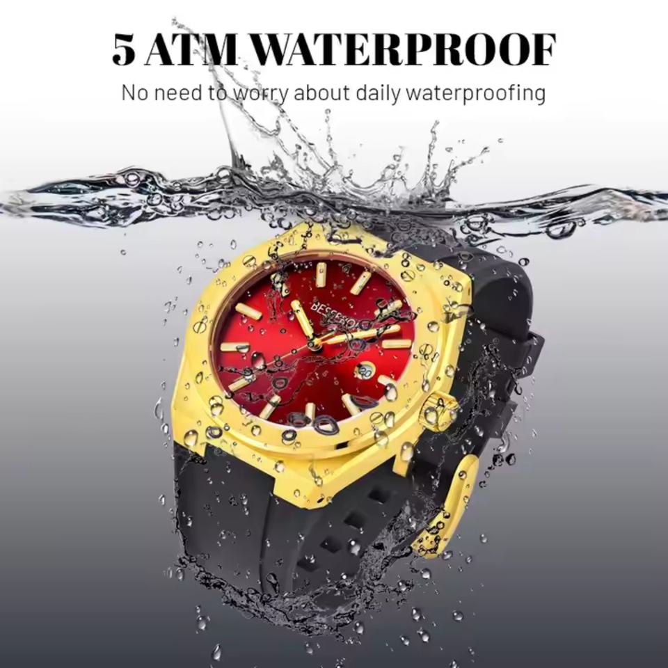 Luxury Men's Quartz Watch Black Rubber Band Gold Case Japanese Movement Business Fashion Style Stainless Steel Waterproof 5BAR