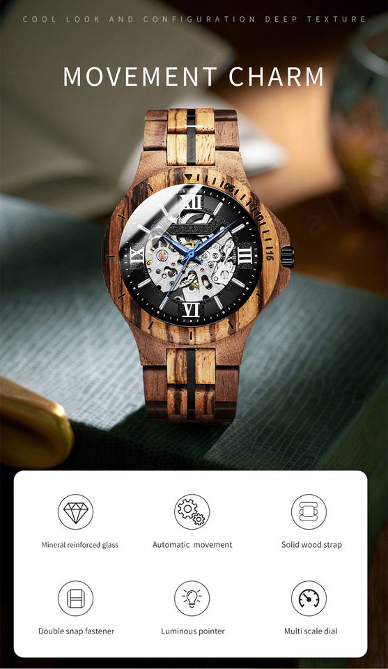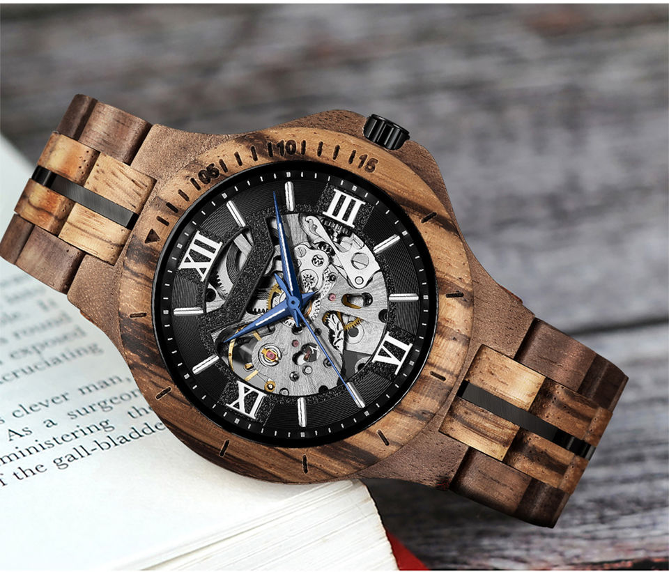 Luxury Men's Stainless Steel Automatic Movement Mechanical Wood Watch OEM Factory's Best Quality Custom Logo Hollow Analog Clock