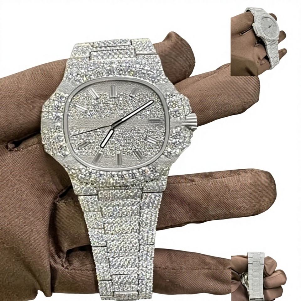 Luxury Men's Stainless Steel & Moissanite Round Cut Iced Out Watch with Glass Dial 10 Bar Water Resistant Hip Hop Style