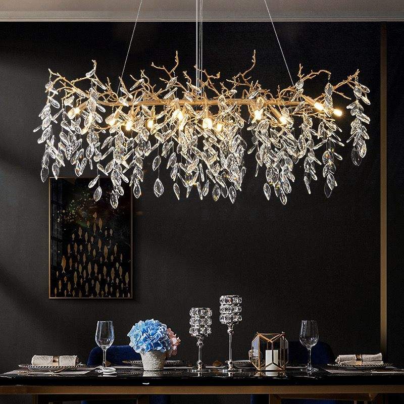 Luxury Metal Crystal Cascade Banquet Hall Art Deco Round Leaf Branch Chandelier Indoor Hanging Lamp Decorative Pendant Light