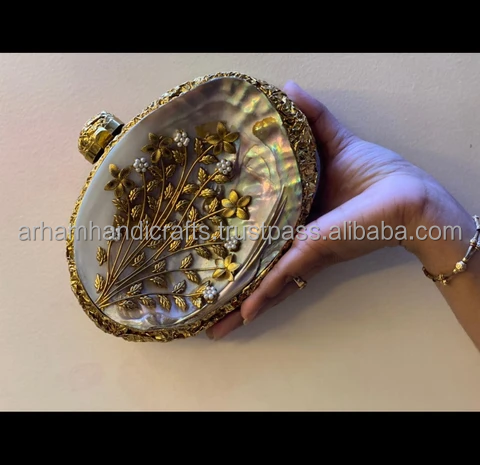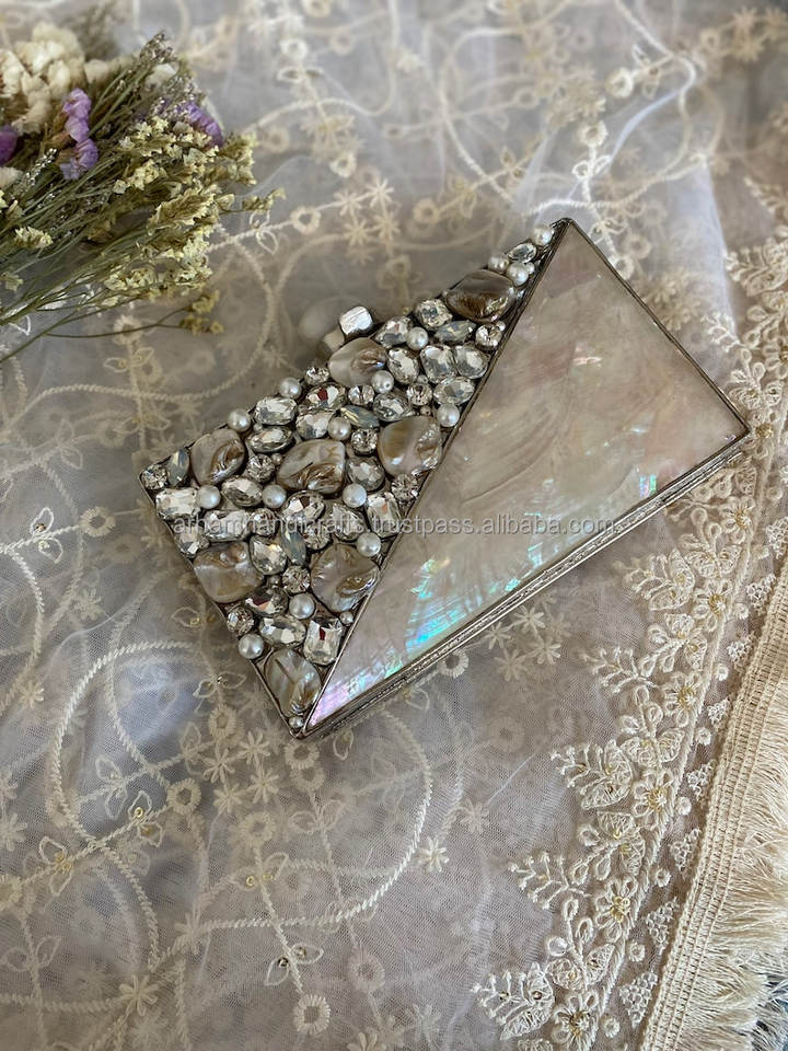 Luxury Metal MOP Mother Pearl Clutch Evening Bag Ladies Party Fashion Handbag With Stone Work Embellishment Wedding Purse