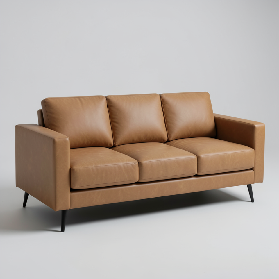 Luxury Mid-Century Modern Genuine Cow Leather Sofa 3 Seater Brown Leather Couch for Living Room with Wooden Construction
