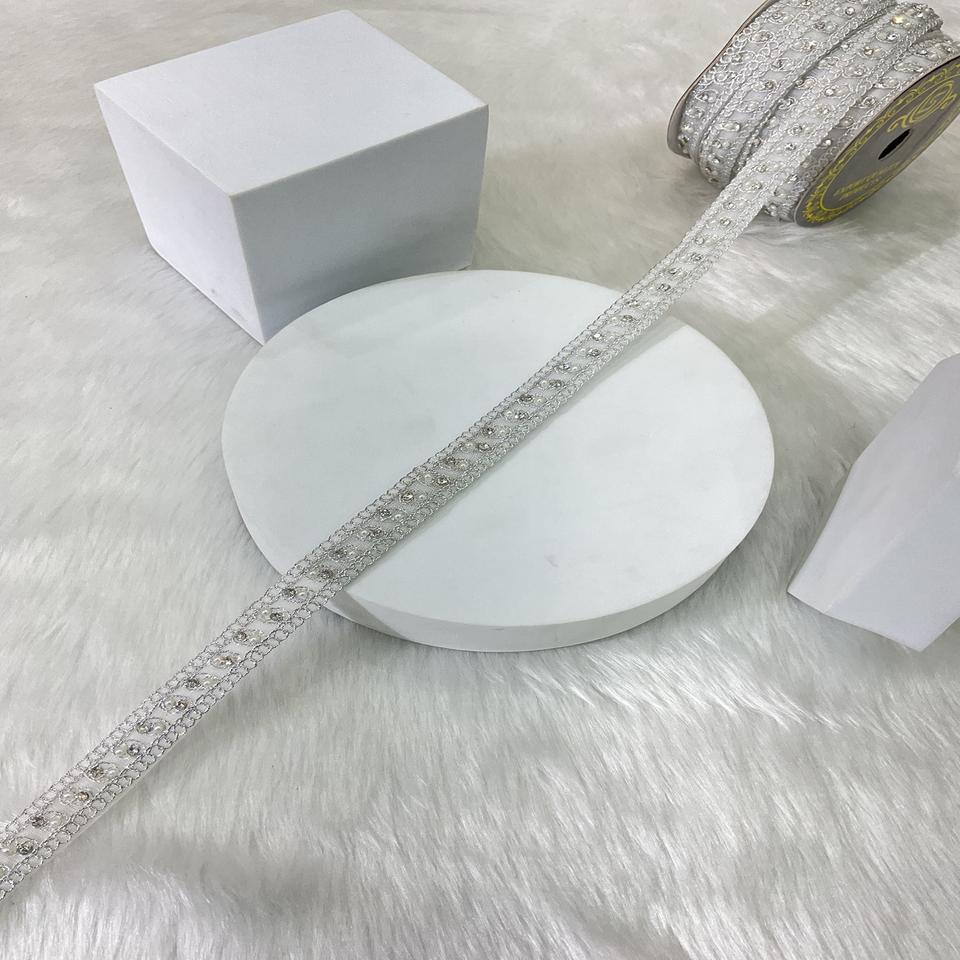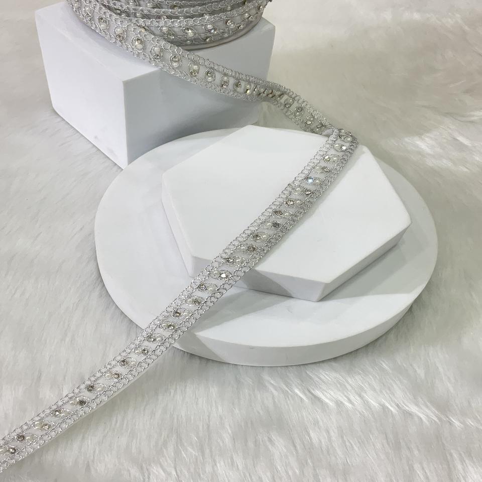 Luxury Mini Diamond Moti Embellished Sarees and Gowns Handcrafted Bridal Wear in Pearl Border Trim Silver Lace Fabric