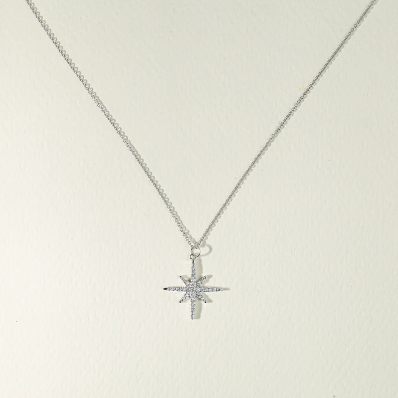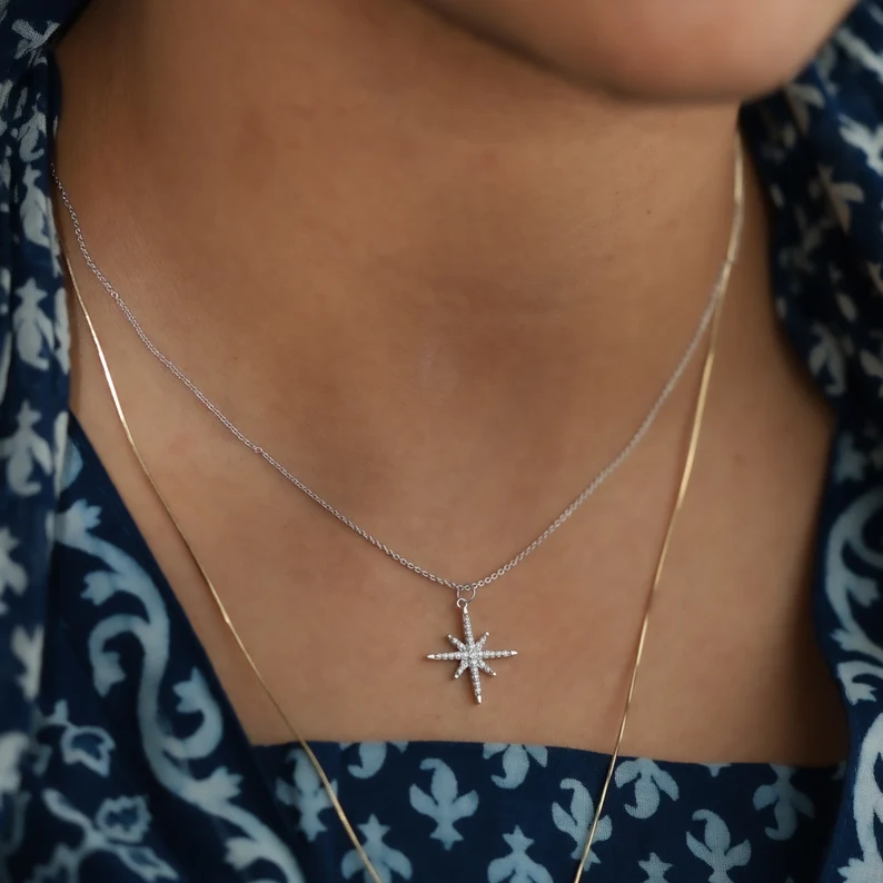 Luxury Minimalist Layered Solid Gold North Star Compass Pendant Dainty Celestial Diamond Necklace Fine Jewelry Gift for Women