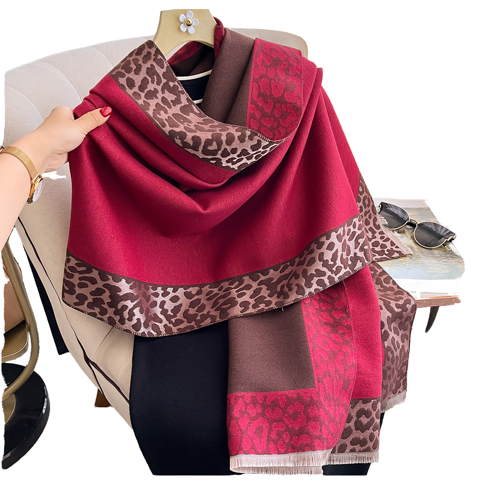 Luxury Minimalist Women's Winter Wrap Warm Fashion Shawl-Faux Cashmere Scarf with Leopard Jacquard Fringe Design Made Polyester