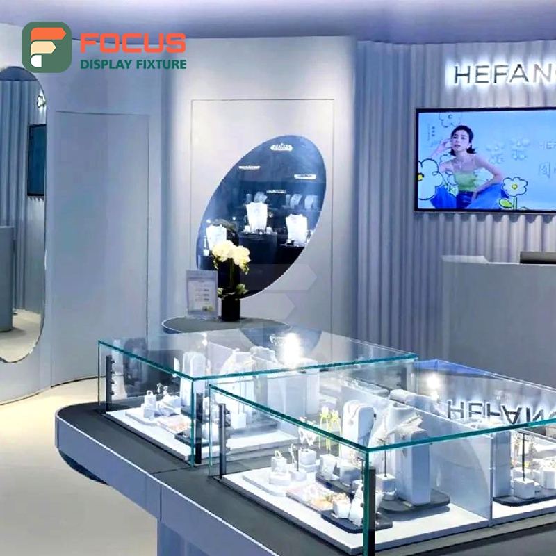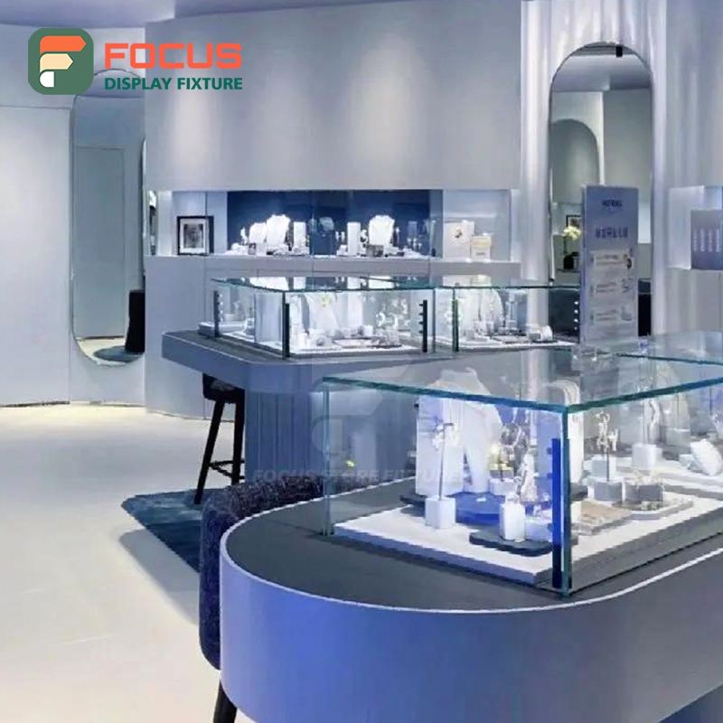 Luxury Modern Jewelry Display Cabinet Glass Wooden Metal LED Lighting High-End Retail Boutique Showcase Interior Display