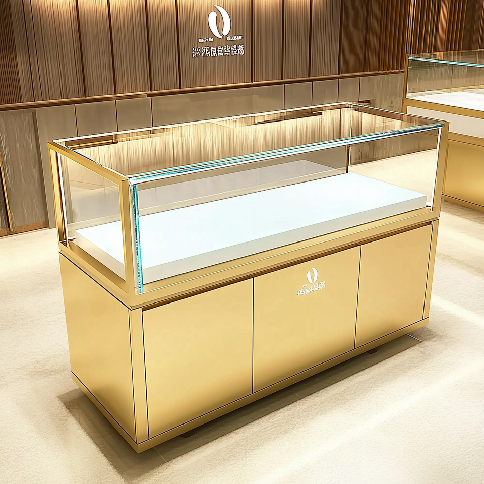 Luxury Modern Jewelry Showcase Cabinet MDF Wood Tempered Glass LED Light Jewelry Display Table Golden Jewelry Showcase