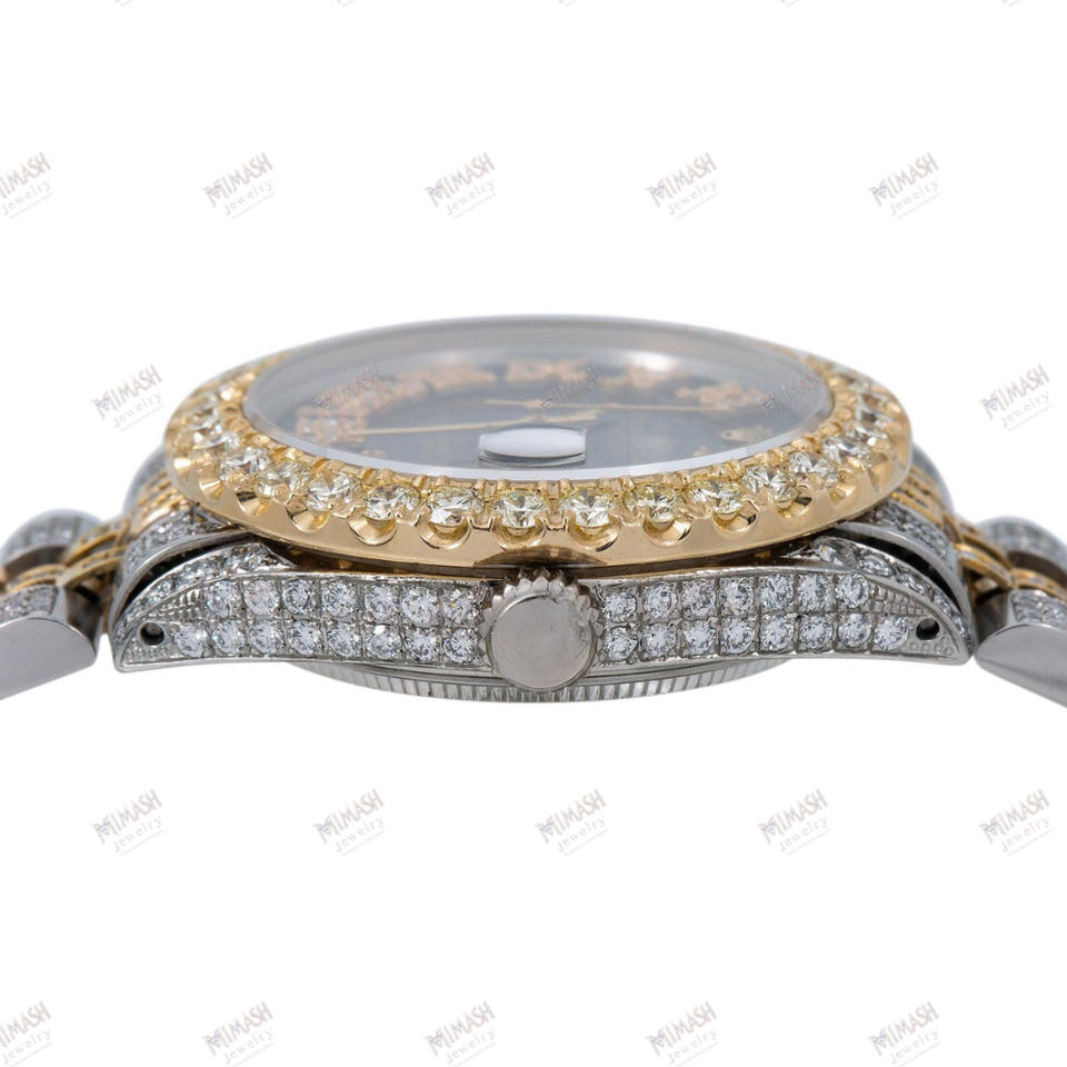 Luxury Moissanite Diamond Roman Numeral Watch with Black Dial, Gold Bezel, and Two-Tone Iced Out Bracelet for Men & Women