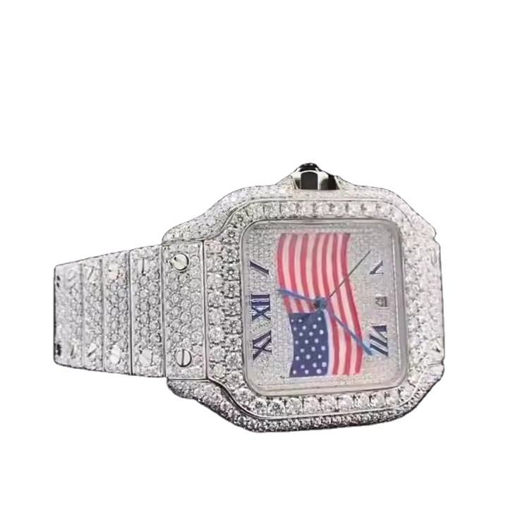 Luxury Yellow Gold Moissanite Leather Strap Chronograph Watch Men Hip Hop Bling Iced Quartz Stainless Steel Waterproof Glass