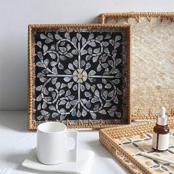Luxury Mother Of Pearl Rattan Tray For Coffee And Snacks Decorative Mother Of Pearl And Rattan Serving Tray By HAND MADE CRAFT