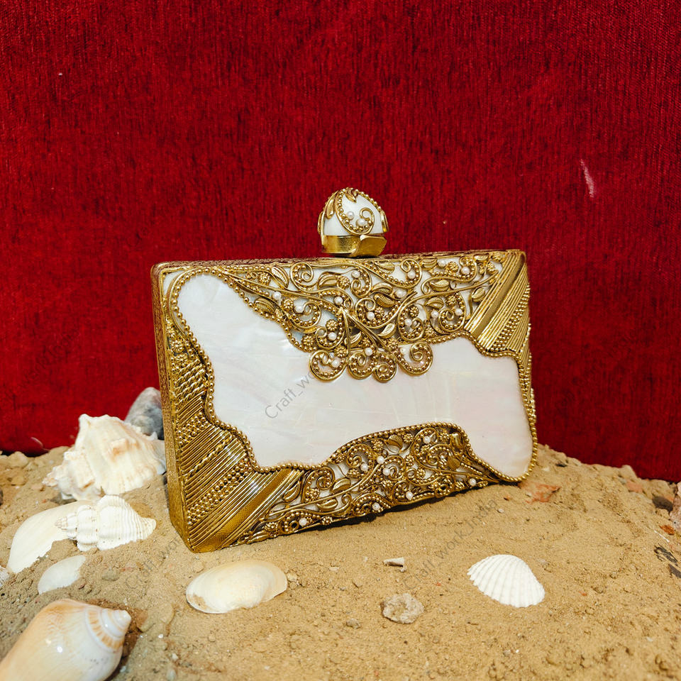 Pattern:Ornate gold filigree on natural mother of pearl