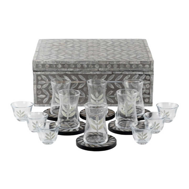 Mother of Pearl Inlay Tea Glass Set with Coasters and Storage Box