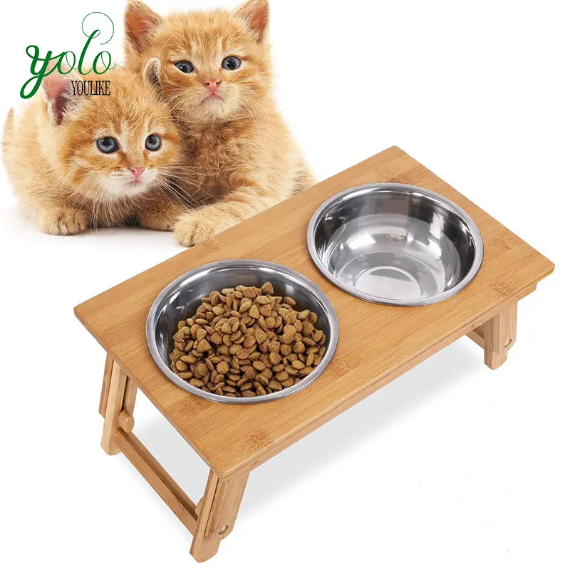 Luxury Natural Bamboo Elevated Dog Cat Food and Water Bowls Stand Feeder for Small and Medium Dogs with 2 Stainless Steel Bowls