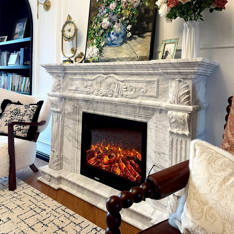 Luxury Natural Stone Hand Craved Real Italian LIght Grey Marble Fireplace Surround Mantel for Indoor Hotel Villa Decor