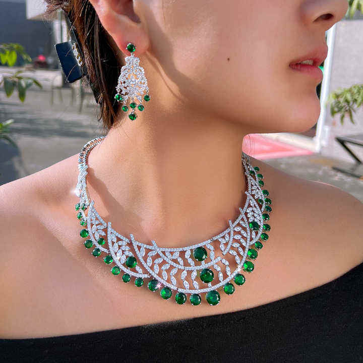Luxury Necklace and Earrings White and Emerald Green Cubic Zirconia Super Big Jewelry Set for Women Banquet Engagement Jewelry